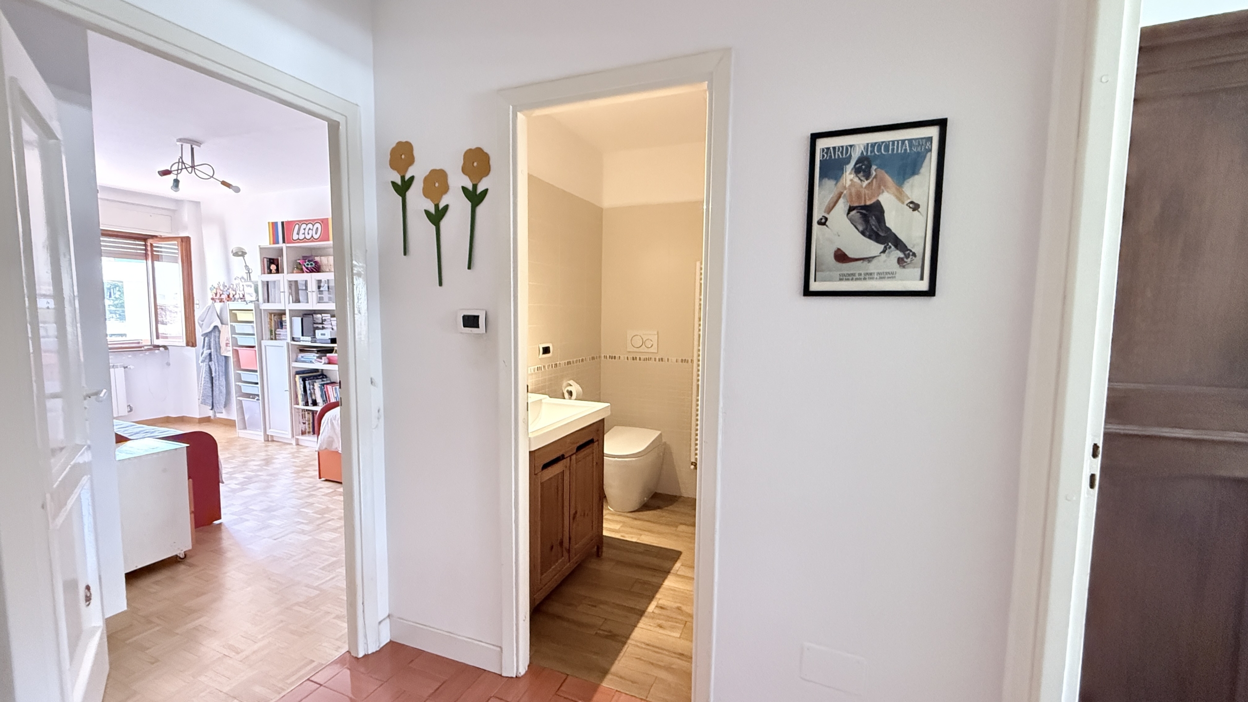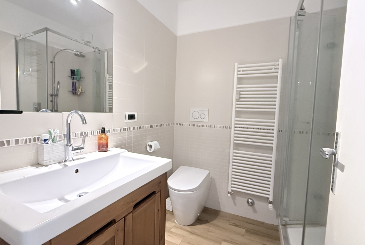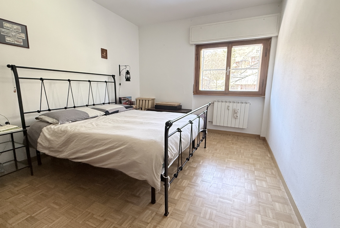 L’ingresso conduce a un luminoso soggiorno di generose dimensioni, arricchito da un terrazzino soleggiato con vista verso le piste da sci del Colomion e Melezet. La zona notte comprende due camere da letto spaziose e confortevoli, perfette sia per uso familiare che per ospiti.