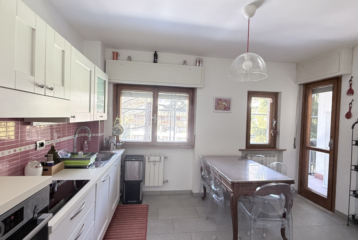 La cucina è abitabile e di ampia metratura, con accesso a un pratico balconcino, che garantisce una piacevole doppia esposizione e un ottimo ricambio d’aria in tutti gli ambienti. L’immobile dispone inoltre di due bagni e di comodi ripostigli.